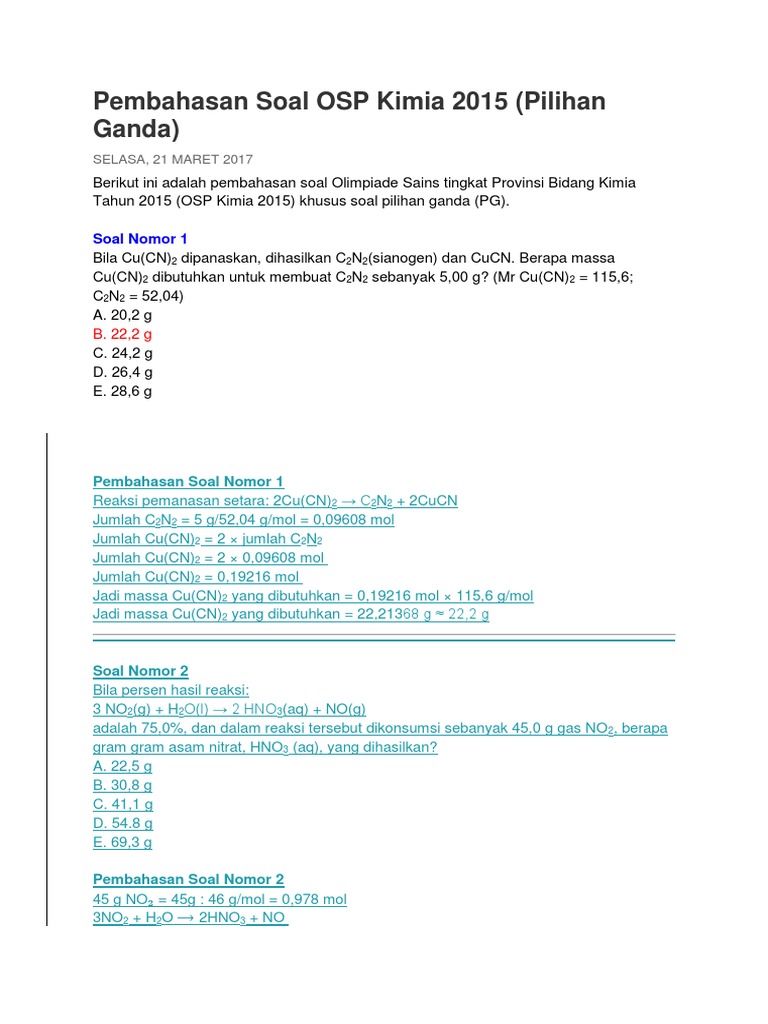 Soal dan pembahasan osk osp osn kimia sma. Soal dan pembahasan osp kimia 2009. Pembahasan soal osp 2015 nomer 4. Berapa massa cu(cn)2 dibutuhkan untuk membuat c2n2 sebanyak 5. Soal olimpiade kimia sma 2015 tingkat provinsi (osp).